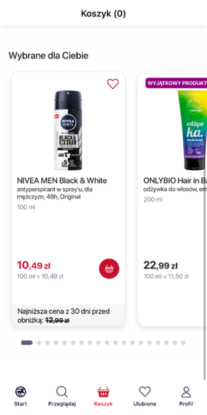 Rekomendacje w aplikacji Rossmann po wybraniu sekcji Koszyk.