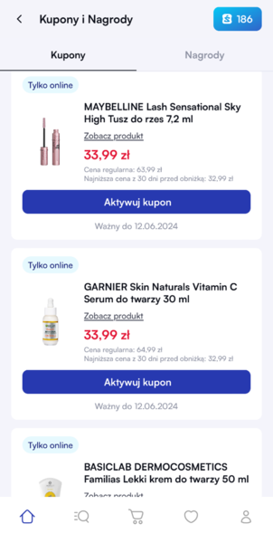 Sekcja Kupony i Nagrody w aplikacji Super-Pharm.