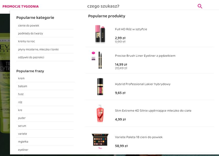 - Zastosowanie funkcji autocomplete, która niezwykle ułatwia dotarcie do produktu, na bieżąco generując podpowiedzi do wpisywanego hasła.