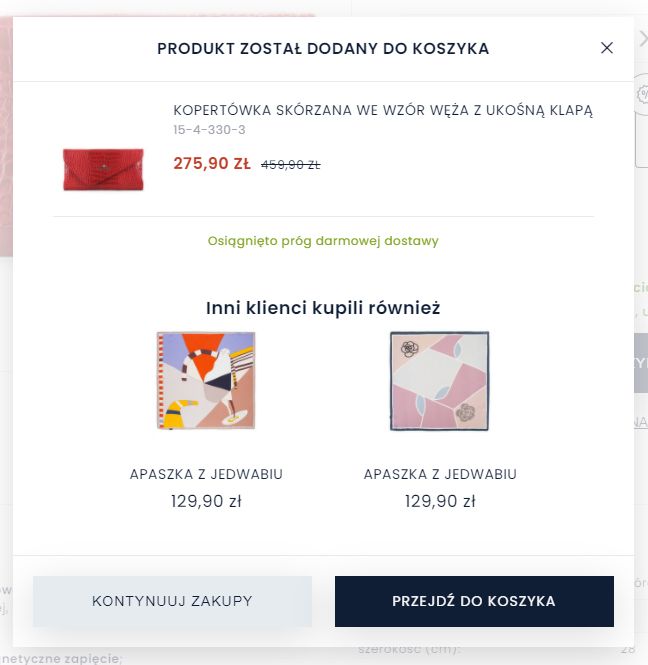 - Cross-selling, czyli produkty uzupełniające ten aktualnie oglądany lub dodany do koszyka.