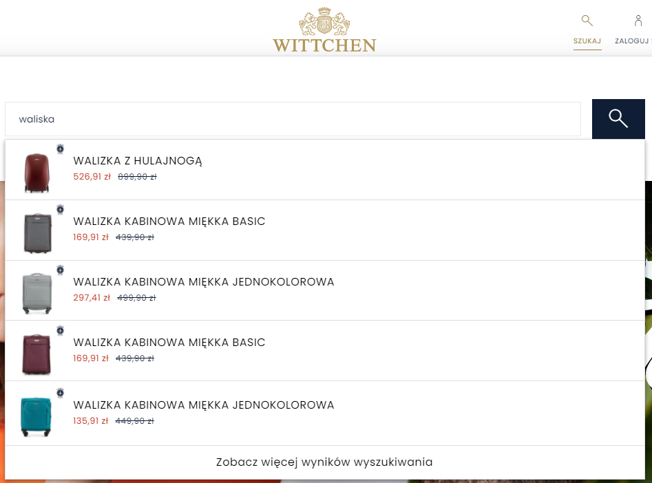Funkcjonalnością, która idealnie wpisuje się w założony cel jest obsługa synonimów i błędów we wpisywanych hasłach. Czy Twój klient odnalazłby sweter, gdyby wpisał kardigan? Czy otrzymałby propozycje produktów, gdyby, szukając walizka niechcący wpisał walzka? Jeśli uwzględnisz w działaniu swojej wyszukiwarce czynnik ludzki, czyli tok myślenia każdego pojedynczego klienta i ryzyko popełniania przez niego błędów, wówczas każde wyszukiwanie będzie generowało wyniki, stwarzając szansę na złożenie zamówienia. 39% e-konsumentów robi to właśnie pod wpływem trafnego procesu wyszukiwania.