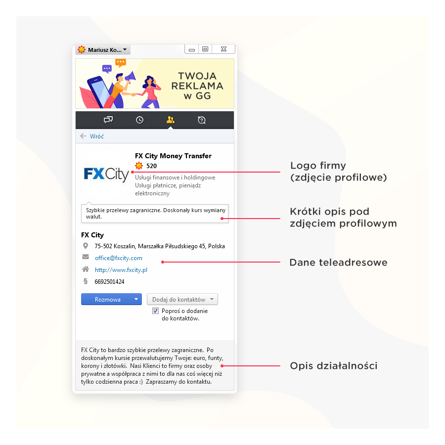 - Reklama powitalna wyświetlana od razu po uruchomieniu komunikatora oraz po dłuższej nieaktywności użytkownika.