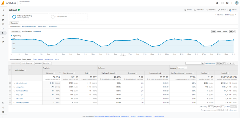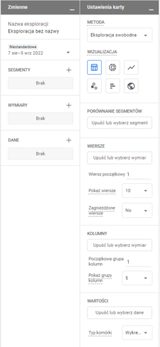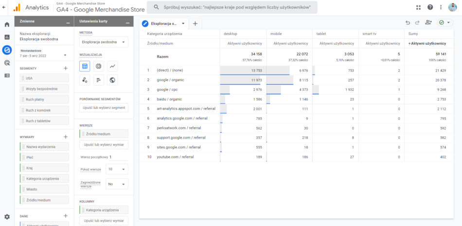 Nie skupiajmy się na wskaźnikach w powyższych przykładach. Chodzi tutaj o część wizualną. Dashboardy posiadają inną budowę. W pozyskaniu ruchu w Google Analytics 4 nie mamy widocznego wykresu w taki sposób, jak w Universal Analytics. Widok ten bardziej przypomina stronę główną i domyślne sposoby prezentacji danych. Eksplorowanie natomiast prezentuje dane w postaci cyfr. Oczywiście sposób wyświetlania można zmienić, ale częściej wykorzystywanym sposobem prezentacji danych będzie tabela taka, jak powyżej.
