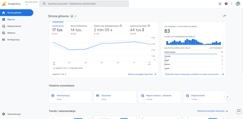 Jak widzimy, kolorystyka pozostała bez zmian, strona główna również nie uległa rewolucji. Uwagę przykuwa za to menu po lewej stronie, które w Universal Analytics było bardziej rozbudowane niż w GA4. Mogłoby się wydawać, że to nowa wersja powinna mieć więcej funkcji, a przynajmniej więcej z nich powinno być widocznych na pierwszy rzut oka. Niestety taki wygląd panelu może sprawić, że osoby przesiadające się z UA poczują się zagubione i nie będą wiedzieć, co zrobić w pierwszej kolejności oraz gdzie znaleźć wskaźniki, z których korzystało się w poprzedniej wersji. Starszy brat, posiadający większą liczbę kategorii w menu był bardziej intuicyjny.