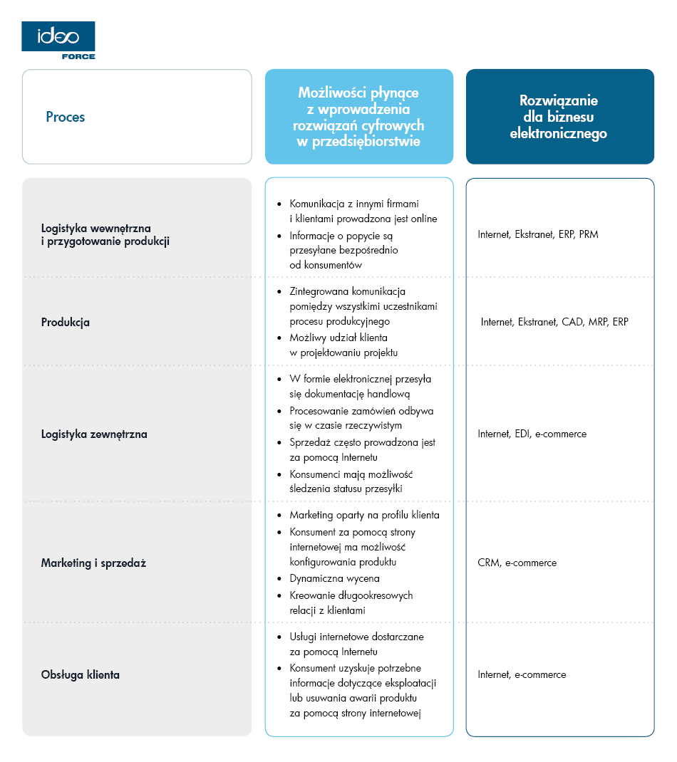 Źródło:Powyższy podział i korzyści płynące z rozwiązań cyfrowych został opracowany na podstawie: C. Żurak-Owczarek, E-biznes w wymiarze globalnym i lokalnym. Analiza i próba oceny, Wydawnictwo Uniwersytetu Łódzkiego, 2013, s. 20 i n.