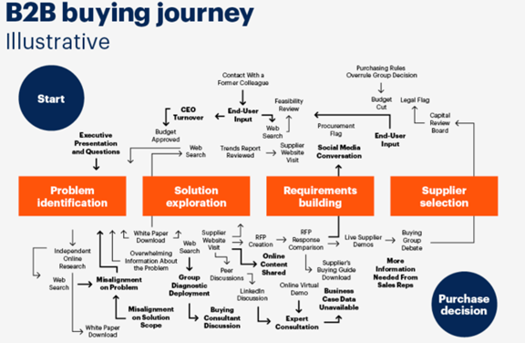 W odróżnieniu od leadów B2C, które pochodzą od indywidualnych konsumentów, leady B2B funkcjonują w znacznie bardziej złożonym ekosystemie decyzyjnym. Tu proces zakupowy rzadko opiera się na impulsie – wymaga analiz, konsultacji i często zaangażowania kilku osób po stronie klienta. Dlatego generowanie leadów w sektorze B2B to nie tylko kwestia przyciągnięcia uwagi, ale także umiejętnego zrozumienia potrzeb organizacji, jej wyzwań biznesowych i sposobu podejmowania decyzji: ta infografika pokazuje to w dobry sposób, choć i tak w dużym skrócie: