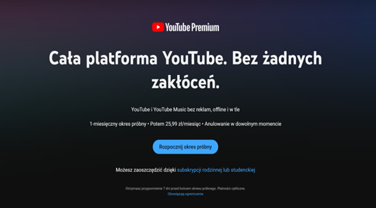 Okresy próbne to doskonały sposób na umożliwienie klientom skorzystania z oferowanej przez nas usługi zupełnie za darmo. Serwisy takie jak Spotify czy YouTube wykorzystują okresy próbne, aby umożliwić skorzystanie z funkcji premium, która polega m.in. na „wyłączeniu” uciążliwych i powtarzających się reklam, które przeszkadzają w regularnym korzystaniu z serwisu.