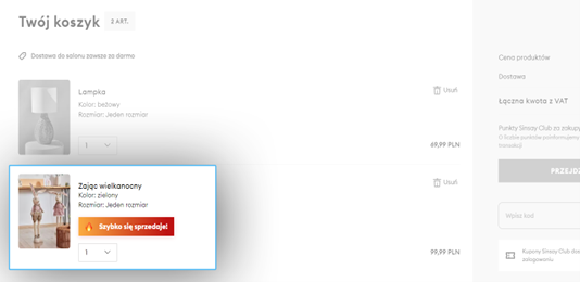 - Widoczność dostępnych sztuk, np. „Pozostało 3 sztuki”,