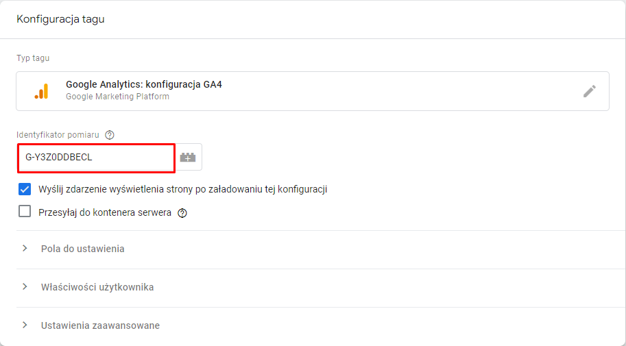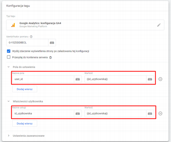 Jeśli na Twojej stronie istnieje możliwość logowania, prześlij do GA4 identyfikator użytkownika. Najłatwiej pozyskać go z warstwy danych wcześniej przygotowanej przez programistę. W tym celu stwórz odpowiednią zmienną warstwy danych, następnie rozwiń sekcję „Pola do ustawienia”. W nazwę pola wpisz „user_id”, a w wartości umieść stworzoną wcześniej zmienną. Pozwoli to GA4 dopasować zdarzenia do konkretnego użytkownika, ten zabieg jest szczególnie istotny, jeśli śledzisz ruch w wielu platformach. Aby uzyskać dostęp do identyfikatora w raportach i eksploracjach rozwiń sekcję „Właściwości użytkownika”. Tym razem nie wpisuj jednak „user_id”, gdyż jest to nazwa zastrzeżona. Użyj innego parametru np. „id_uzytkownika”. Jako wartość ponownie wstaw zmienną warstwy danych. Zapisz.