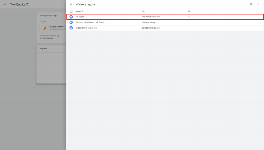 Przejdź do ustawień reguły uruchamiającej tag i wybierz „All Pages”, tag zostanie wywołany przy wyświetleniu każdej z podstron, w których znajduje się kontener GTM.