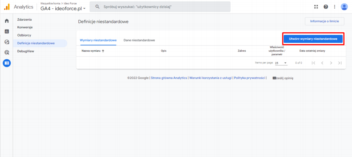 Przejdź do swojej usługi GA4, następnie Konfiguracja -> Definicje niestandardowe -> Wymiary niestandardowe i kliknij „Utwórz wymiary niestandardowe”. Nazwij wymiar np. „Identyfikator użytkownika”, zakres ustaw na „Użytkownik”, a w polu „Właściwość użytkownika” wpisz wcześniej zdefiniowaną w GTMie nazwę, w tym wypadku „id_uzytkownika”. Zapisz.
