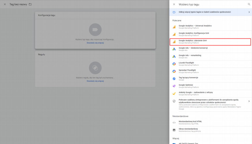 Podobnie jak wcześniej kliknij „Nowy” na podstronie Tagi, a następnie przejdź do konfiguracji tagu. Tym razem jednak wybierz typ tagu: Google Analytics: zdarzenie GA4.