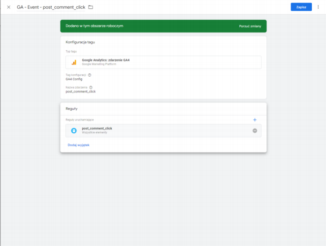 Dodaj odpowiednią regułę, nazwij tag i zapisz. Zdarzeniom możesz również dodać określające je parametry i/lub parametry użytkownika, który tego zdarzenia dokonał.