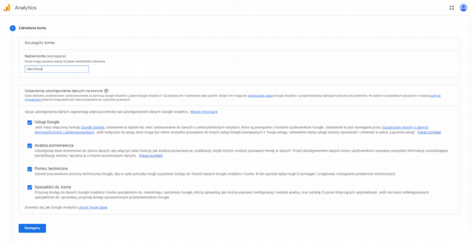 Po kliknięciu przycisku „Rozpocznij pomiary”, wpisz nazwę swojego konta, a następnie przejdź do konfiguracji usługi.