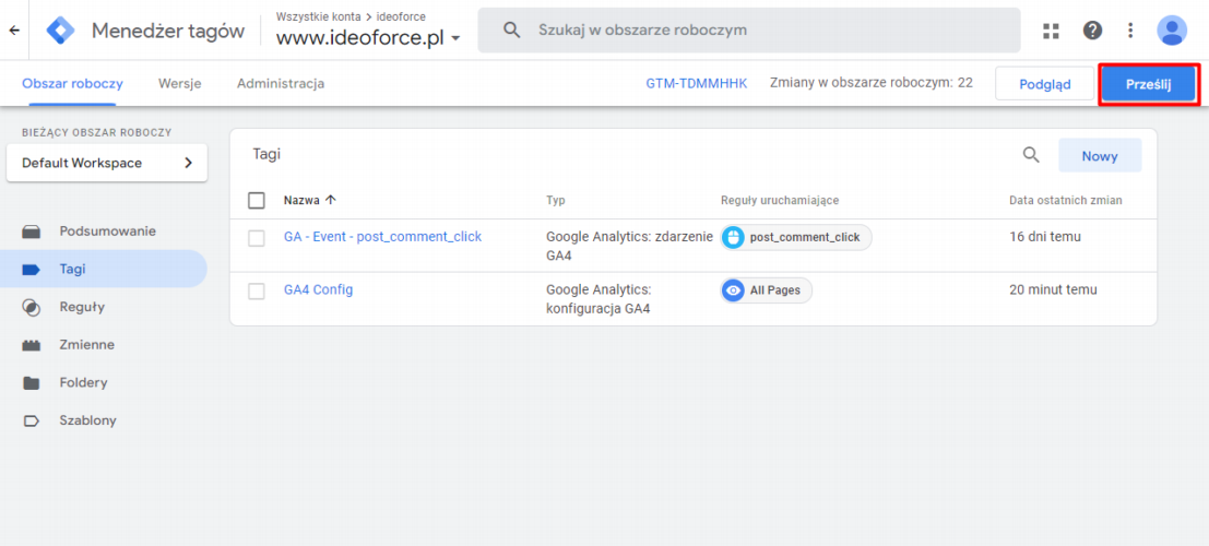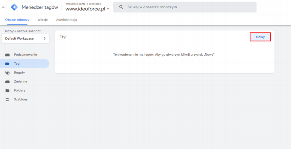 Zacznijmy od tagu konfiguracyjnego. W tym celu przejdź do sekcji Tagi i utwórz nowy Tag.