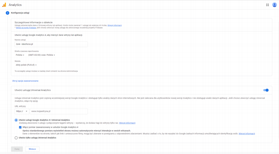 Wpisz nazwę usługi (przed nazwą właściwą warto dodać skrót reprezentujący rodzaj usługi np. GA4, UA), podaj swoją strefę czasową oraz walutę, którą chcesz posługiwać się w raportach. W zależności od czasu, w jakim czytasz artykuł, możesz posiadać opcję utworzenia równolegle usługi Universal Analytics, w tym celu rozwiń opcje zaawansowane, przesuń suwak w prawej części i uzupełnij wymagane dane. Wypełnij krótką ankietę (możesz ją również pominąć), a następnie kliknij przycisk „Utwórz”. Po zaakceptowaniu regulaminu Twoje konto Google Analytics (jeśli wcześniej go nie posiadałeś) oraz usługa GA4 zostaną utworzone.