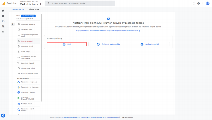 GA4 w przeciwieństwie do GA3 nie posiada widoków, ich miejsce w strukturze konta zajęły strumienie danych, czyli w skrócie źródła, z których dane przesyłane są do Google Analytics. Nowa usługa pozwala na skonfigurowanie strumieni danych z 3 platform: Witryny, Aplikacji na Androida oraz Aplikacji na IOS. Dziś pominiemy aplikacje i skupimy się jedynie na witrynie internetowej. Przejdź więc do konfiguracji platformy „Sieć”.