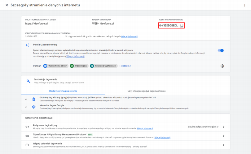 Analytics wygeneruje unikalny Identyfikator pomiaru. Skopiuj go.