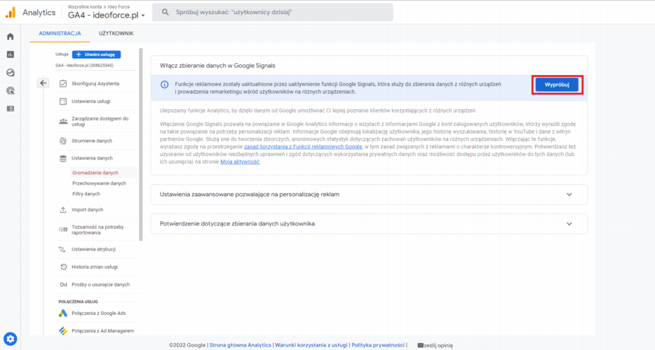Zanim przejdziemy do instalacji tagu, przejdź do Administracja > Ustawienia danych > Gromadzenie danych i włącz Google Signals.