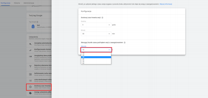 Przechodząc do swojego strumienia danych w sekcji „Strumienie danych”, a następnie klikając w Skonfiguruj ustawienia tagów -> Dostosuj czas trwania sesji, możesz również zmienić czas, po jakim sesja ma być uznana za sesję z zaangażowaniem.