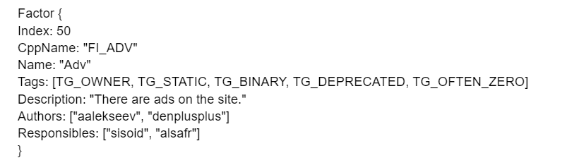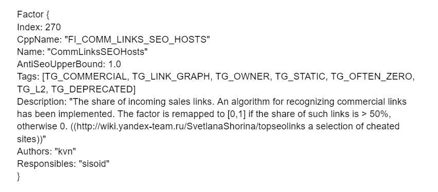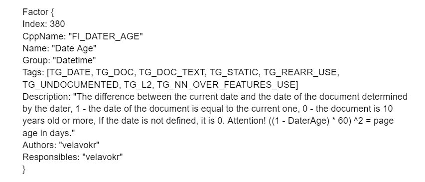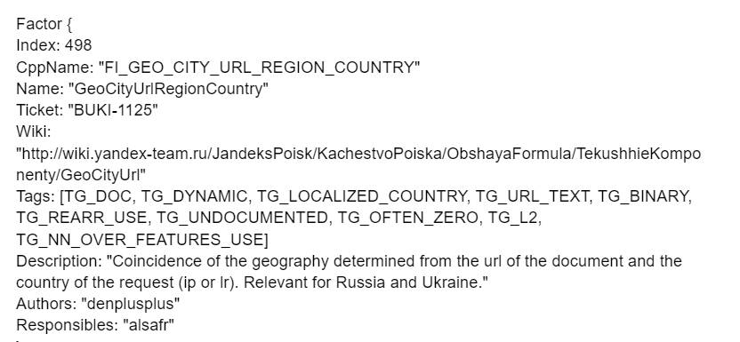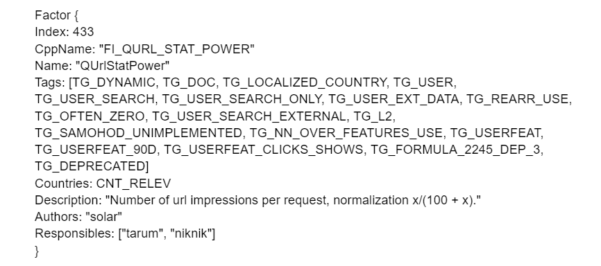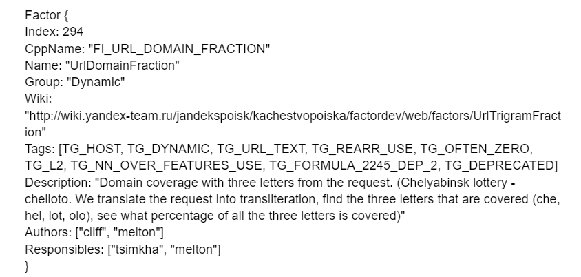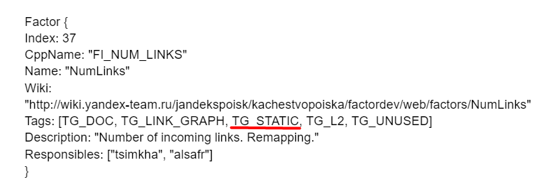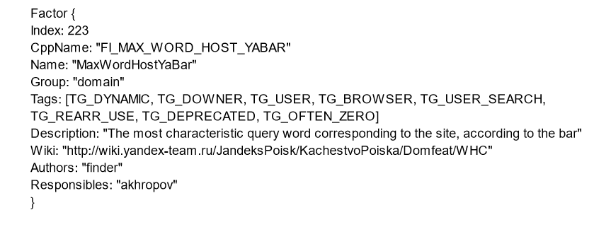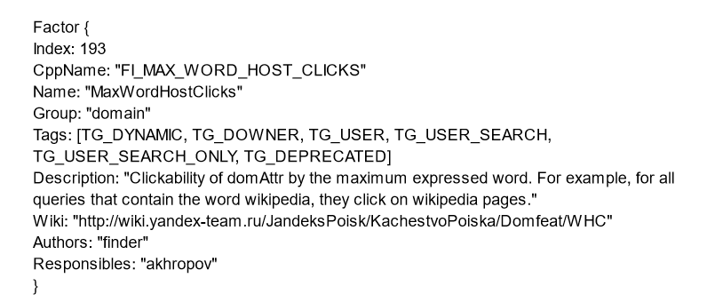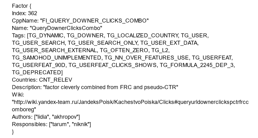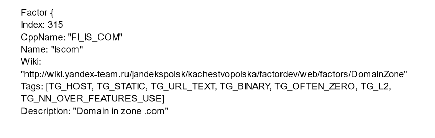 - Yandex klasyfikuje swoje czynniki za pomocą tagów np. TG_DYNAMIC - czynniki dynamiczne, TG_STATIC – czynniki statyczne.