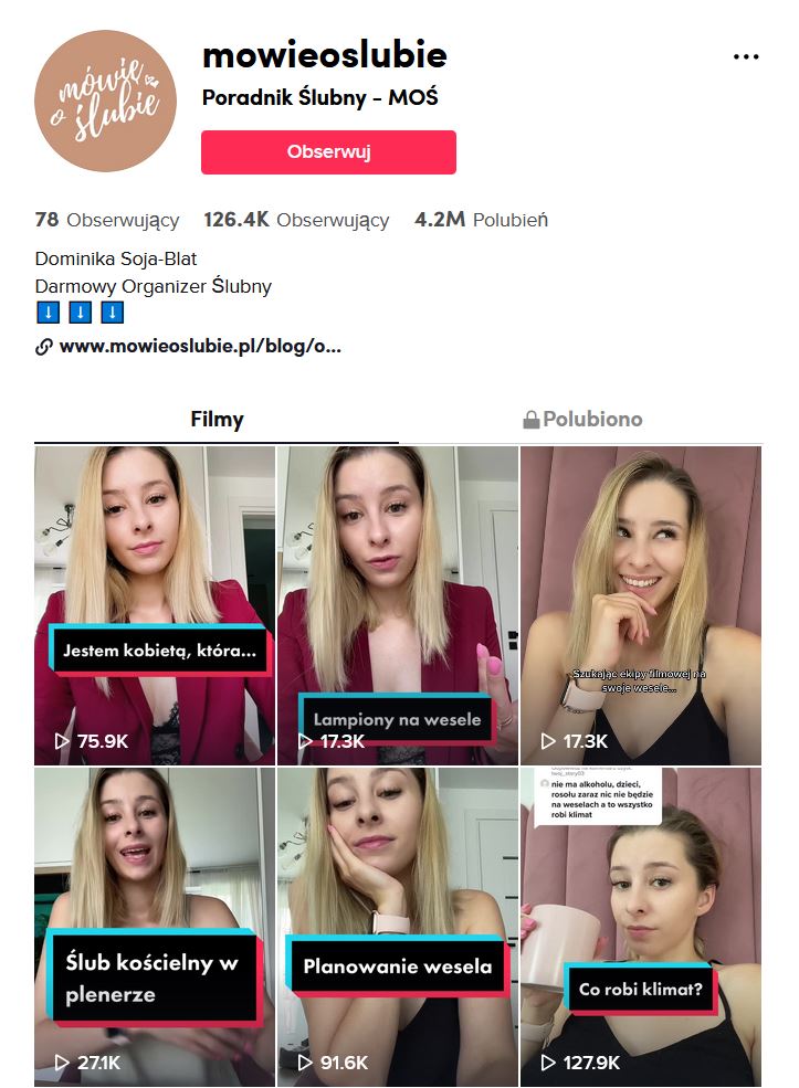 - Prowadząc wszystkie social media, zachowaj ten sam styl i język wypowiedzi, aby był spójny. Jeśli chodzi o klientów ślubnych, to bardzo ważne jest to, aby używać dużo emocjonalnych określeń i podkreślać wagę wydarzenia, jakim będzie ich ślub.