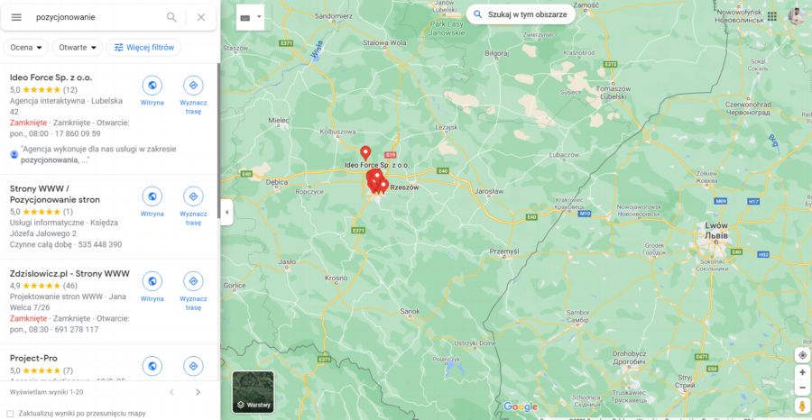 Zrzut ekranu z wyników wyszukiwania w mapach Google na słowo "pozycjonowanie".