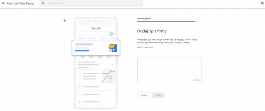 Następnie należy podać opis firmy, który wyświetlać będzie się w wynikach wyszukiwania. Dodanie zdjęć do wizytówki Google Moja Firma pozwoli na przyciągnięcie większej liczby klientów, dlatego warto dodać przynajmniej logo firmy, zdjęcie na okładkę i kilka innych prezentujących ofertę firmy lub sklepu dla którego zakładamy profil.