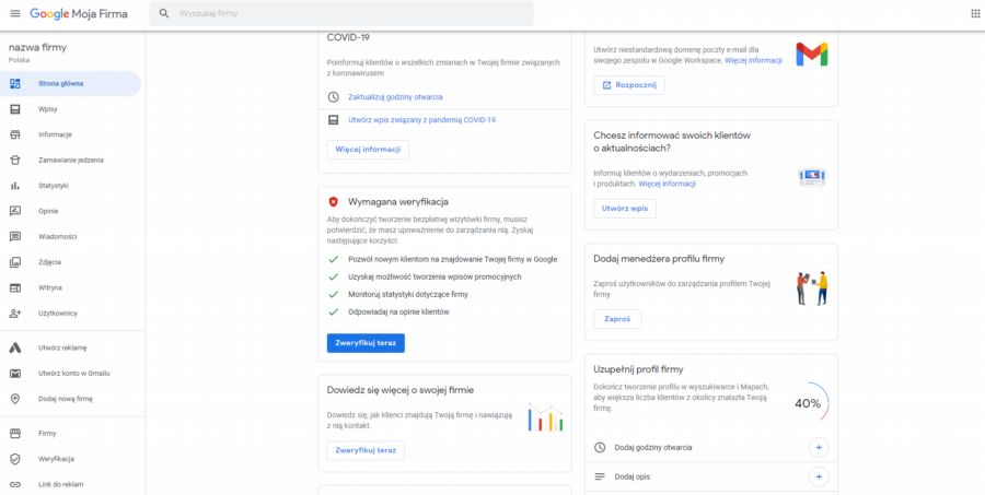 Zrzut ekranu z panelu Google Moja Firma prezentującego funkcjonalności narzędzia.