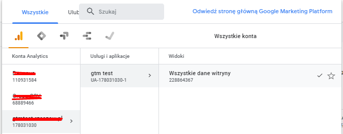 3. Znajdujemy kolumnę usługi à „Wszystkie usługi” – tam pojawi nam się lista usług, które możemy połączyć z danym widokiem GA.