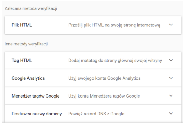 Najpopularniejszych sposobem weryfikacji konta Google Search Console jest wgranie pliku HTML na serwer lub dodanie fragmentu kodu do sekcji <head> naszego serwisu. Pozostałe sposoby takie, jak rekord DNS w domenie wymaga kontaktu z zarządcą domeny, a weryfikacja poprzez Google Analytics czy Google Tag Manager jest często problematyczna w związku ze sposobem osadzania tych kodów w popularnych CMS’ach.