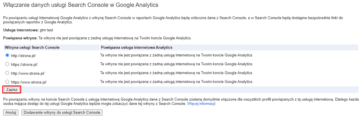 6. Zostajemy przekierowani na stronę w GSC, gdzie możemy wybrać, jaką usługę na naszym koncie chcemy połączyć z GA. Wybieramy właściwy adres naszej strony i zapisujemy.