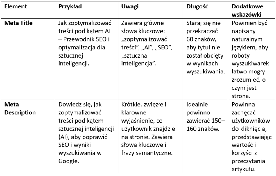Meta title i meta description powinny być precyzyjne, angażujące i zgodne z intencją użytkownika. Przykłady znajdują się w tabeli: