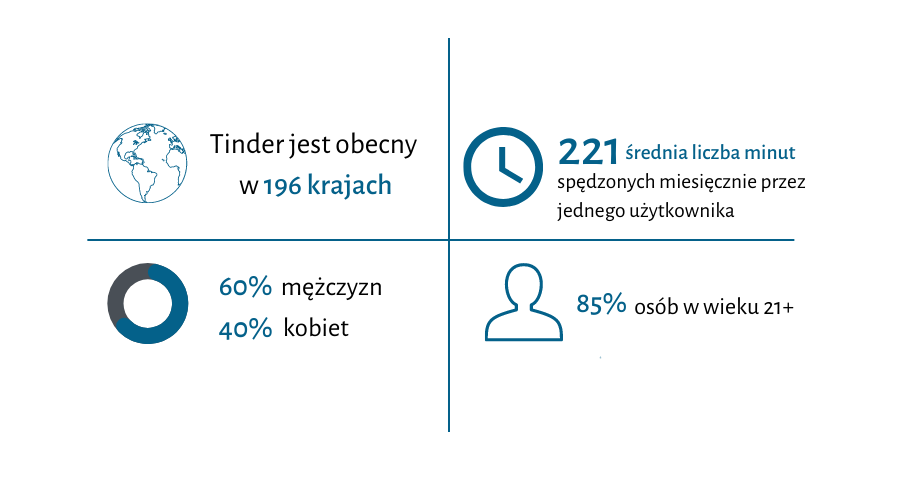 Tinder to obecnie najpopularniejsza aplikacja randkowa na całym świecie. Portal obecny jest w 196 krajach, a liczba pobrań w 2020 r. przekroczyła 74 mln. Najliczniejszą grupą osób na Tinderze są osoby w wieku 18-35 lat, bo stanowią 83% wszystkich użytkowników. W przypadku płci liczby plasują się to następująco - 60% mężczyźni, 40% kobiety.