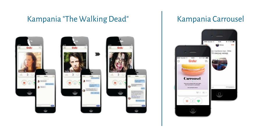 Kreatywność niektórych kampanii to wisienka na marketingowym torcie. Przykład? Promocja serialu „The Walking Dead” w Stanach Zjednoczonych. Cały zamysł reklamy polegał na tym, że kilka fikcyjnych profili kobiet zostało sparowanych z 500 profilami mężczyzn. W momencie wymiany wiadomości pomiędzy połączonymi użytkownikami, zdjęcia profilowe kobiet zamieniały się w… wizerunek zombie. Ta kampania jest świetnym przykładem na to, że na Tinderze ogranicza nas jedynie wyobraźnia.