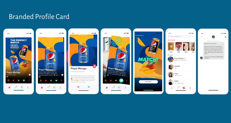 Ten format reklamy przypomina nieco profil użytkownika na Tinderze. Taka reklama wyświetla się na stronie głównej aplikacji, gdzie użytkownik przegląda profile innych osób. Wyświetlane zdjęcie, a właściwie zdjęcia (bo można dodać ich 6), obejmuje logotyp marki, imię/nazwę oraz opis. Zamiast zdjęć, można dodać też teaser. Użytkownik, tak jak w przypadku innych profili, może odrzucić lub polubić profil marki. Jeśli wybierze tę drugą opcję, jest automatycznie przenoszony do „It’s a Match”, gdzie pojawia się kolejny teaser oraz wiadomość (w skrzynce Inbox). To właśnie ten format został wykorzystany w reklamie serialu „The Walking Dead”.