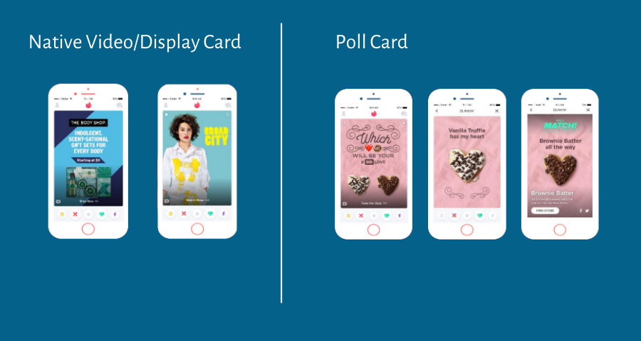 - Tinder oferuje pięć formatów reklamowych - Branded Profile Card, Native Display Card, Native Video Card, Sponsored Inbox Message i Poll Card.