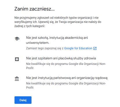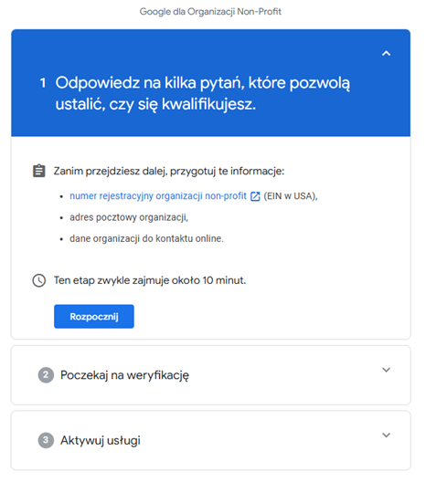 Drugim etapem jest rejestracja organizacji w Google dla Organizacji Non-Profit (https://www.google.com/nonprofits). Po kliknięciu „rozpocznij” system w łatwy sposób przeprowadzi Cię przezt en etap. W tym miejscu korzystamy także z naszego wcześniej wygenerowanego tokenu.