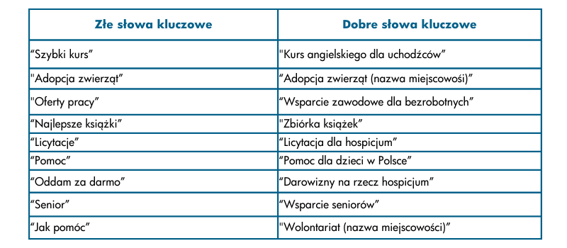 Słowa kluczowe muszą być powiązane z misją organizacji. Google wymaga, aby każda fraza używana w kampanii była ściśle związana z działalnością organizacji. Oznacza to, że nie można używać ogólnych słów typu „pomoc” czy „wsparcie” – trzeba być bardziej precyzyjnym.
