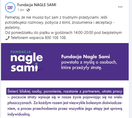 Inkluzywność należy zachować również, prowadząc komunikację skierowaną do odbiorców, będących w żałobie. W tym specjalizuje się m.in. Fundacja NAGLE SAMI, która prężnie działa w mediach społecznościowych.