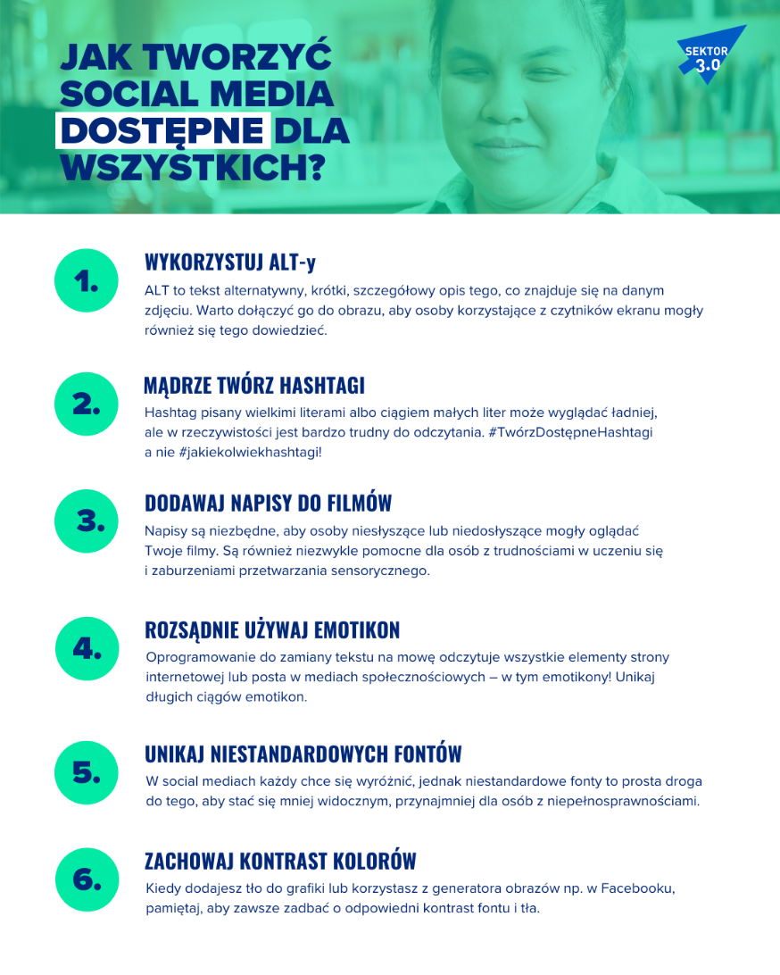 Na tworzenie takich treści do mediów społecznościowych, które będą dostępne dla wszystkich, zwraca uwagę m.in. Sektor 3.0. To przedsięwzięcie Polsko-Amerykańskiej Fundacji Wolności, wspierające proces transformacji cyfrowej i wykorzystywania nowoczesnych technologii, aby usprawniać działania społecznie użyteczne.