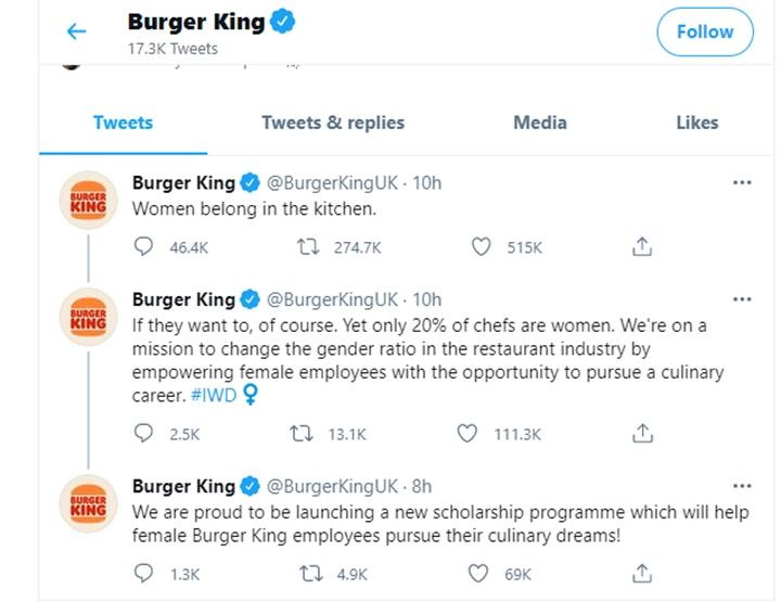 Burger King, znana sieć restauracji fast food, w marcu 2021 roku stała się tematem kontrowersji ze względu na swoją kampanię marketingową z okazji Dnia Kobiet. Na swoim oficjalnym koncie Twitterze firma opublikowała kontrowersyjny wpis, w którym napisała: "Women belong in the kitchen" ("Kobiety należą do kuchni"). Doprowadziło to do intensywnych dyskusji wśród internautów.