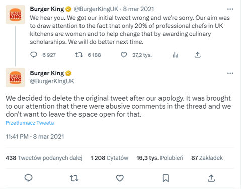 Źródło: eu.usatoday.com/story/money/2021/03/08/burger-king-uk-under-fire-women-belong-kitchen-tweet/4627505001/.