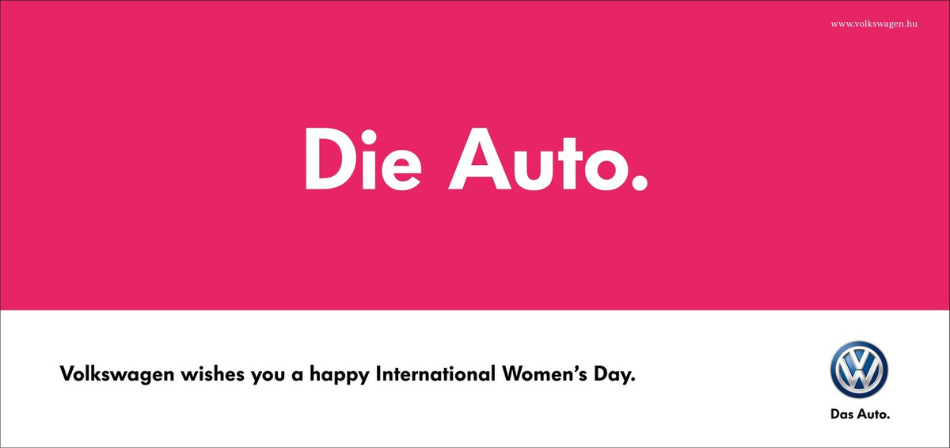 Volkswagen, marka motoryzacyjna znana głównie z męskiej odmiany samochodu "Das Auto" w języku niemieckim, postanowiła zaskoczyć i wprowadzić nietuzinkową reklamę z okazji międzynarodowego dnia kobiet. Na bilbordach pojawiło się hasło reklamowe "Die Auto", umieszczone na mocnym różowym tle.