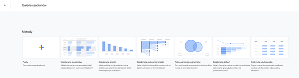 - Eksploracje - eksploracje dzięki swojej elastyczności pozwalają nam analizować gromadzone dane w sposób, który wcześniej nie był dostępny. Można stworzyć własną eksplorację lub skorzystać z jednego z dostępnych szablonów:
