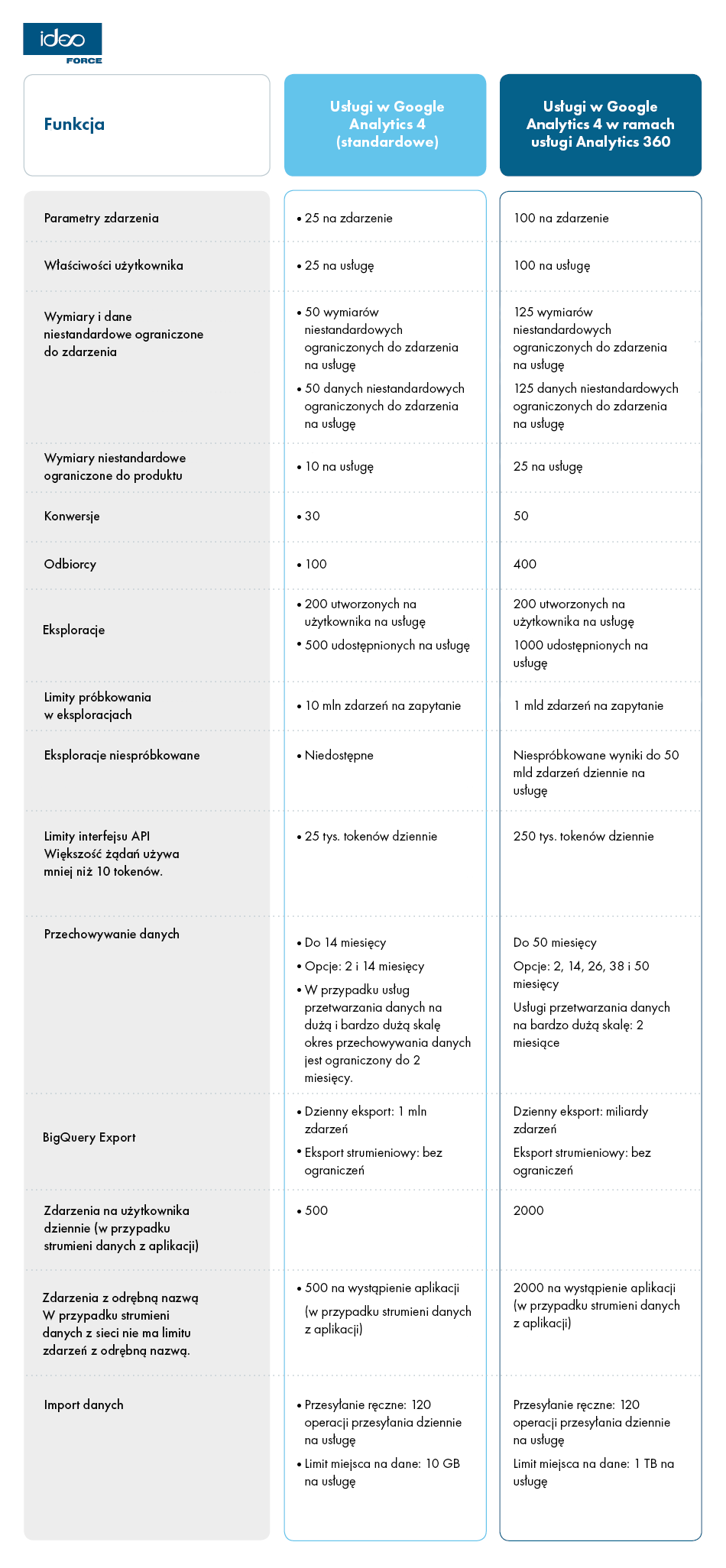 To tylko wybrane z różnic, pomiędzy Google Analytics 4 a Google Analytics 4 360. Poniższa tabela zawiera pełne porównanie.