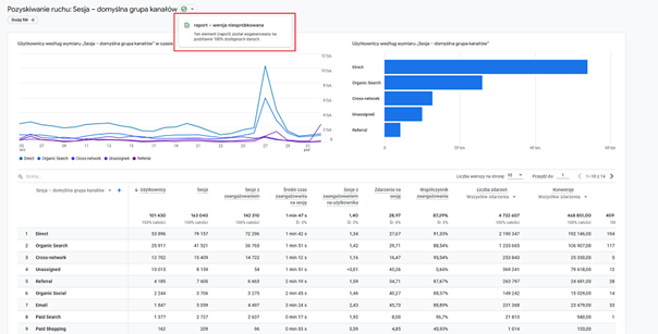 - Próbkowanie danych - to proces analizowania i raportowania pewnego wycinka wszystkich danych. Jest wykorzystywany do analizy dużych zbiorów danych i pozwala zwiększyć efektywność kosztową oraz czasową. Wersja próbkowana oznacza, że przeanalizowane dane są jedynie pewnym wycinkiem całości. Dane niepróbkowane to element, który został wygenerowany na podstawie 100,0% dostępnych danych.