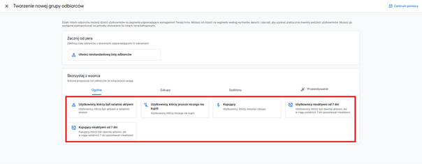 - Odbiorcy - grupa użytkowników, charakteryzujących się podobnymi cechami w okresie danego czasu. Jeden użytkownik może należeć do więcej niż jednej listy odbiorców. Można tworzyć niestandardowe grupy odbiorców lub skorzystać z jednego z dostępnych szablonów: