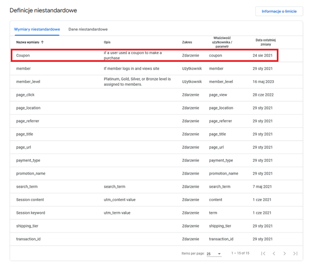 - Wymiary i dane niestandardowe, ograniczone do zdarzenia - pozwalają mierzyć zdarzenia, które nie są standardowo opomiarowane przez GA4. Przykładowo może to być indywidualne ID naszego klienta. GA4 w wersji darmowej pozwala na ustawienie 50. wymiarów i 50. danych, natomiast GA4 360 oferuje możliwość ustawienia 125. wymiarów i 125. danych: