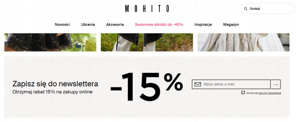 Zrzut ekranu prezentujący newsletter na stronie internetowej Mohito.com.